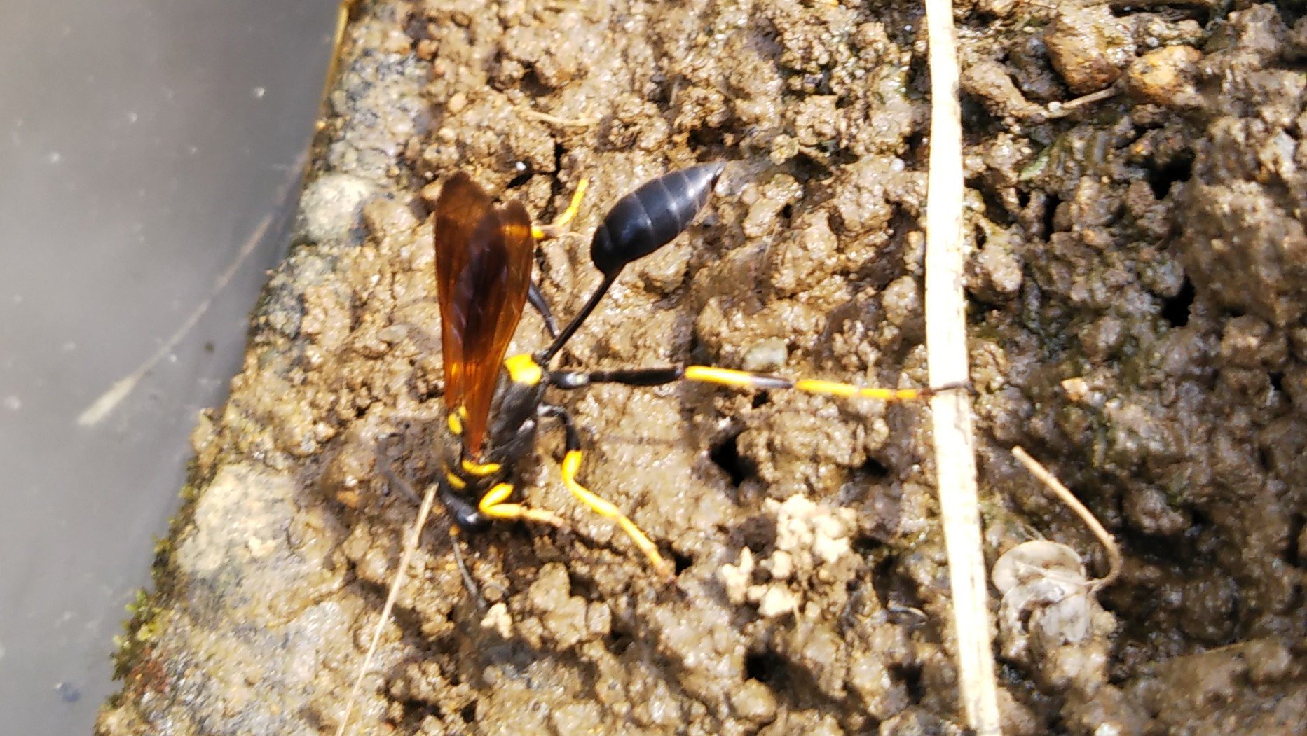 のじゃこ 畑の側溝の脇で しきりと泥を掻き集めるハチを見つけました 極限まで細い胴と黄色の長い脚が目を惹きます アメリカジガバチと言う蜂のようです どこかで巣作りをしているんですね 蜂 ドロバチ ジガバチ アメリカジガバチ T